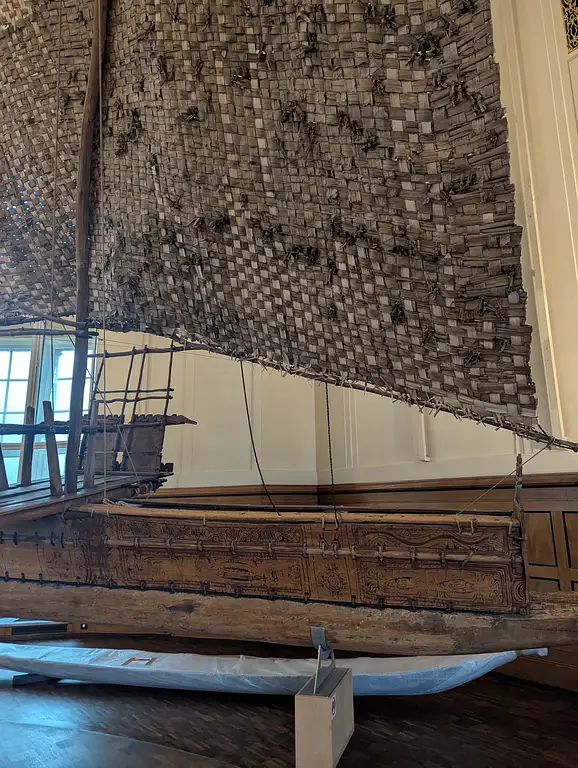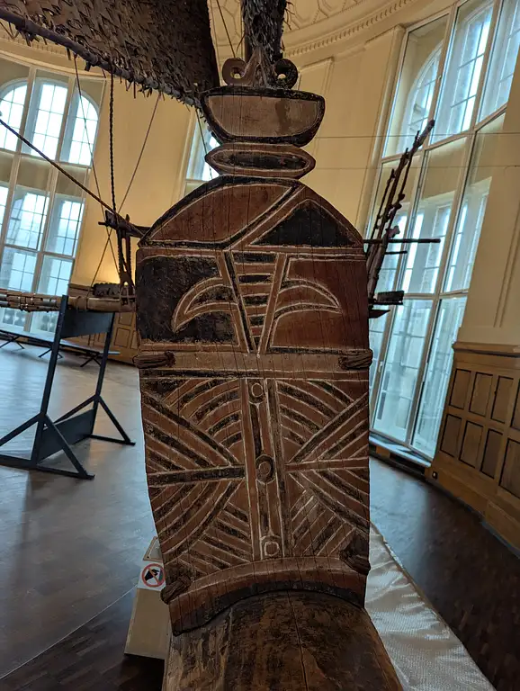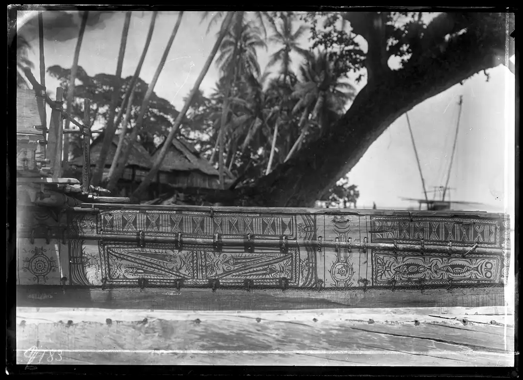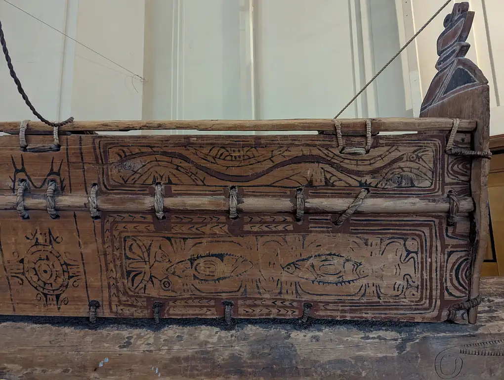 The ornamentation of the Siassi boat is a striking feature, which includes the decorative motifs on the side planks that were directly painted onto the wood. The motifs on the wave breaker, on the other hand, were created with the help of flat cuts: The contours and ornaments were carved in, dug out and then white paint was rubbed into the recesses. The hull and the ama have detailed relief carvings depicting figures and faces complemented with chip carving patterns.