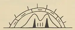 ‘The next drawing [...] depicts a landscape, and the Siassi artist modelled it on the coast of Umbai opposite his boat construction workshop. [...] Thus the large arch covering everything represents Mount Lolos; the upright lines are standing trees, the horizontal lines are fallen trees. In front of this great mountain are two cones, the mountains Liplip and Moramtusu, and the two dark, upright spikes are supposed to be two particularly large trees.’ (Vogel 1911: 177)